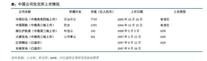 当前伦交所主板上市公司数量达 1065 家,总市值约 4 万亿英镑;境外公司 266 家,总市值约 1.7 万亿英镑, 占主板总市值 42.5%。AIM 市场上市公司数量 958 家,总市值 1048.1 亿英镑,境外公司 249 家,总市值约 282.6 亿英镑,占 AIM 总市值比例 27.0%。当前有大唐发电、浙江沪杭甬、中国国航 3 家中国公司以普通股方式在伦 交所上市,而中国石化、江西铜业和东南发电在伦交所以 GDR 形式上市。2009 年 11 月 27 日与 2013 年 2 月 21 日,江西铜业与东南发电分别在伦交所正式退市。