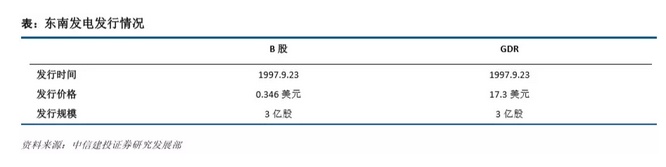 浙江东南发电股份有限公司为浙江省电力行业唯一一家上市企业,成立于 1997 年 5 月,同年 9 月,公司 发行境内上市外资股(B 股,代码为 900949.SH 及全球托存凭证(GDR),分别在上海证券交易所和伦敦证券交易 所上市交易。 东南发电共计发行B股6亿股,发行价为每股2.868元人民币(折合0.346美元),其中3亿股以GDR (0909QLT) 形式配售,发行价格 143.3 元人民币(折合 17.3 美元)。每份 GDR 代表 50 股 B 股,共发行 600 万份。于 1997 年 9 月 23 日分别在上交所和伦交所上市。