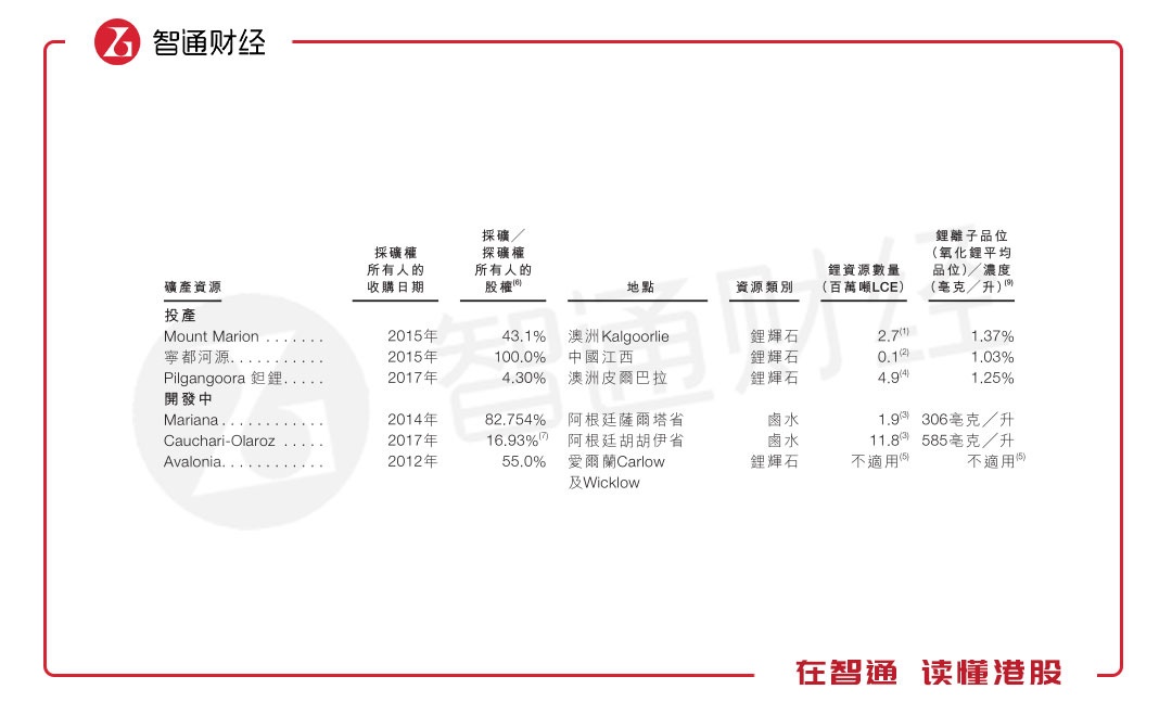 据智通财经APP了解,赣锋锂业已经在上游掌控了一定的锂矿资源。公司早于2011年开始收购锂资源的股权,并于2015年在全球范围内策略性增加对锂资源的投资。截至2017年12月31日,公司在位于澳洲、阿根廷、中国及爱尔兰的共六个锂资源中拥有股权。通过这些锂资源投资,赣锋能够取得稳定供应的优质锂原材料。