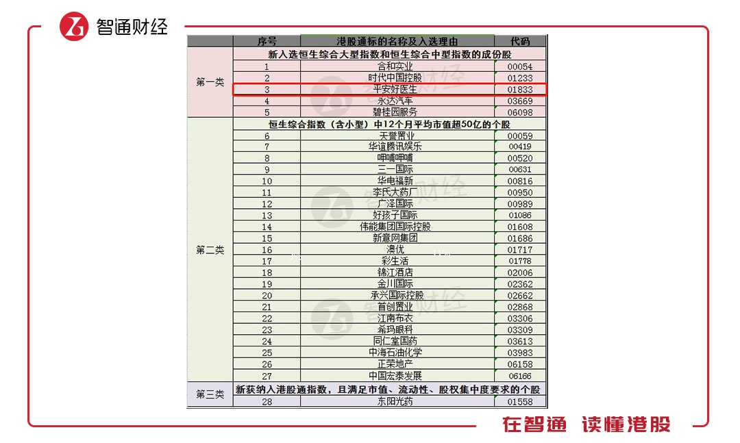 港股通会在每年的3月和9月进行集中调整。日前,恒生指数有限公司 (恒生指数公司)公布截至2018年6月29日之恒生指数系列季度检讨结果,其中平安好医生成功入选恒生综合大型指数和恒生综合中型指数的成份股,变更将于2018年9月10日起生效,届时平安好医生将正式纳入港股通,且被列为第一类成份股。