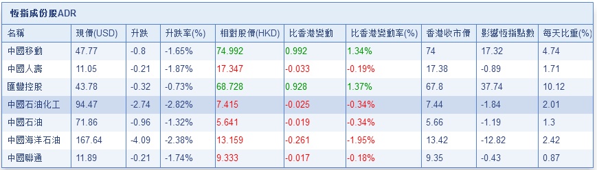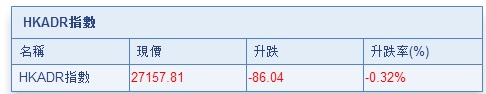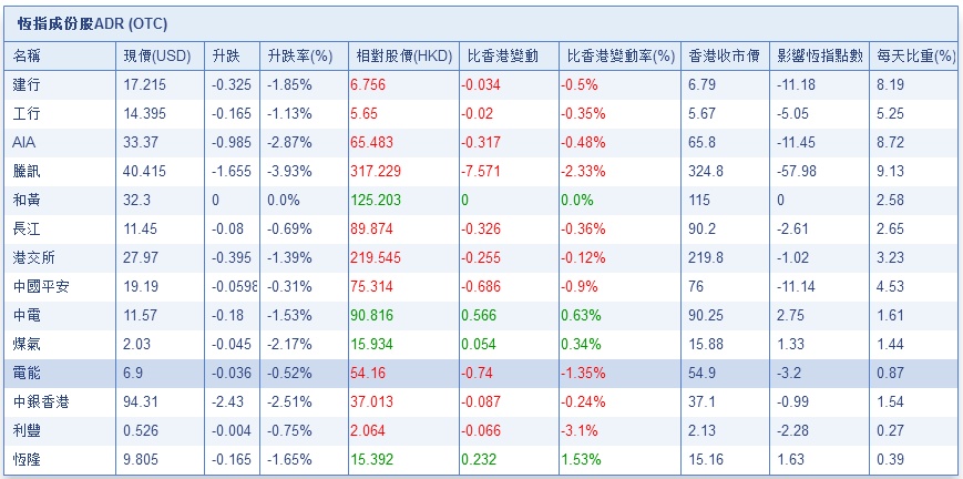 智通财经APP获悉,9月5日,港股ADR高开低走。截至收盘,按比例计算,收报27157.81点,跌86.04点或0.32%。蓝筹个别发展,汇丰控股收报68.72元,较港收市升0.928元;腾讯控股收报317.23元,较港收市跌7.57元,跌幅2.33%。内银股下跌,建设银行收报6.756元,较港收市跌0.034元。
