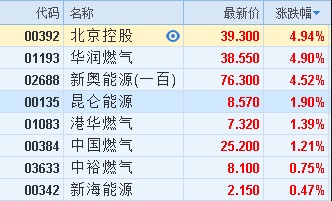 智通财经APP获悉,国务院日前印发《关于促进天然气协调稳定发展的若干意见》,要求加大国内勘探开发力度,利好天然气板块,北京控股(00392)现上涨,截至10时06分,涨5.07%,报价39.35港元,成交额4794万。