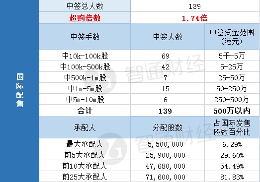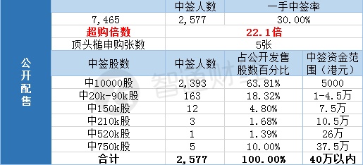 其中,公开配售申购人数7465,一手中签率30%,超购倍数22.1倍。