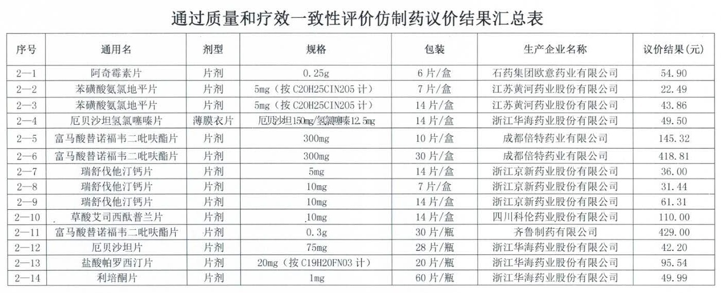 在议价的品种中,通过一致性评价全部议价成功的14个药品包括石药(01093)欧意的阿奇霉素片、江苏黄河的苯磺酸氨氯地平片、浙江华海的厄贝沙坦片、京新药业的瑞舒伐他汀钙片、科伦药业的草酸艾司西酞普兰片、成都倍特和齐鲁制药的富马酸替诺福韦二吡呋酯片等。