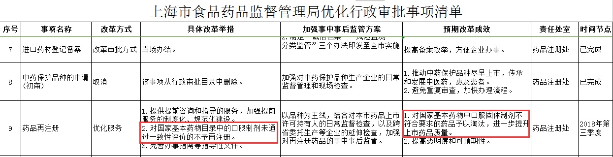 在清单“药品再注册”事项中,明确“加强对再注册药品的事中事后监管”“对国家基本药物目录中口服制剂未通过一致性评价的不予再注册”“对国家基本药物中口服固体制剂不符合要求的药品予以淘汰”。