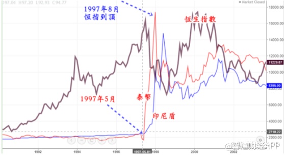 回顾1997年,当时泰国首先出事,之后波及其他周边的国家。当时经济及外汇储备比较好的亚洲四小龙,如台湾,新加坡及香港等都不能受免。泰币及印尼盾在1997年5月出事(如上图),恒指因资金从这些国家套现出现流入,之后再因问题恶化在同年1997年8月见顶,10月正式发生问题。所以笔者认为一旦今年新兴市场出事,香港很难不会受到波及。