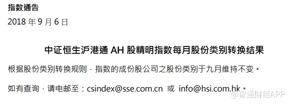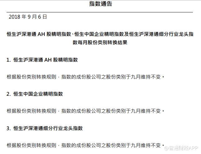智通财经APP获悉,9月6日,恒指公司发布沪、深港通AH股精明指数等4个指数股份类别转换结果,于9月维持不变。
