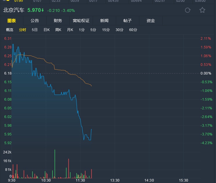 截至发稿,北京汽车报5.97港元,跌3.40%。