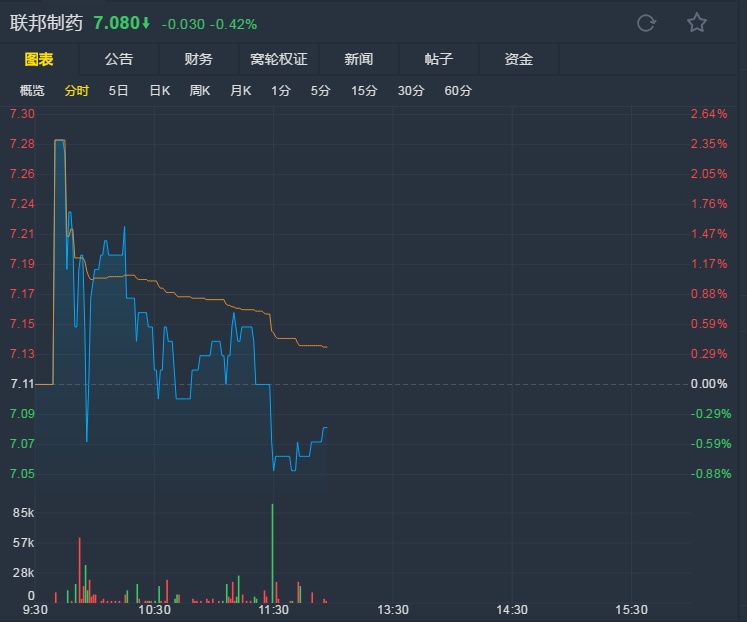 临近上午收盘,联邦制药报7.08港元,跌0.42%。