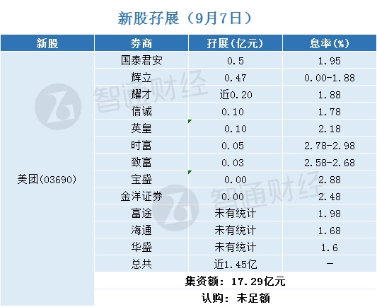 智通财经APP获悉,美团(03690)在香港招股开始,截至9月7日,富途、海通及国泰君安等12家券商总共为其借出近1.45亿孖展金,未足额。