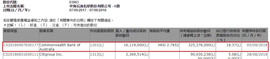智通财经APP获悉,根据联交所资料显示,澳洲联邦银行于9月5日减持中海石油化学(03983)1611万股,每股作价2.79元,总值4488万元,最新持股量降至18.37%。