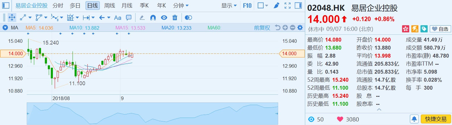 易居(02048)首份中期业绩公布后的一周,股价平收于14港元,而同期内,恒指下跌3.28%,内房股下挫5.85%。相比低迷的大市,易居近期的表现稍显稳健,股价背后的支撑来自良好的基本面。