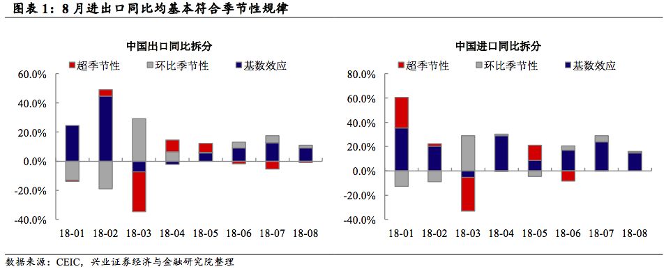 8月进出口数据没有超季节性的“惊喜”。从基数、季节性规律和超季节性来看,8月进出口环比仅小幅低于季节性规律,因此同比主要受到基数的影响。