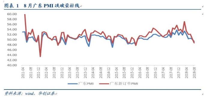 8月广东制造业PMI环比回落0.9个百分点至49.3,为16年3月以来的第一次跌破荣枯线。广东省信委发言人分析称:“(广东)工业经济运行总体平衡,但受外部环境出现明显变化影响,稳中有变的形式已经初步显现。”从构成PMI的五大指数来看,反映供需状况的生产指数和新订单指数降幅最大,分别由7月的51.6和50.4降到了本月的50.1和48.7,降幅达到了1.5和1.7个百分点。