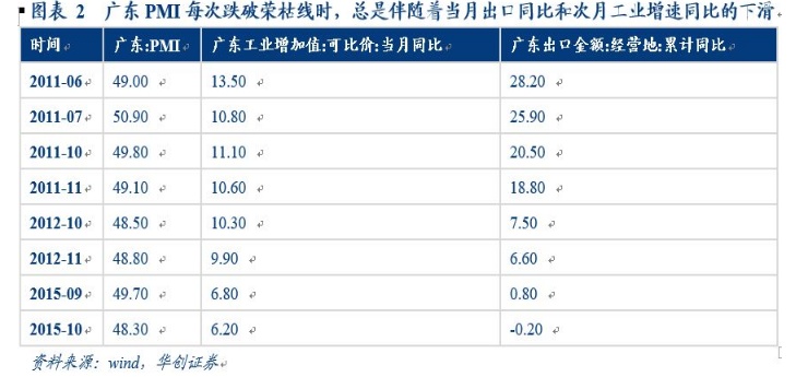 1、广东PMI每次跌破荣枯线时,总是伴随着当月出口同比和次月工业增速同比的下滑。