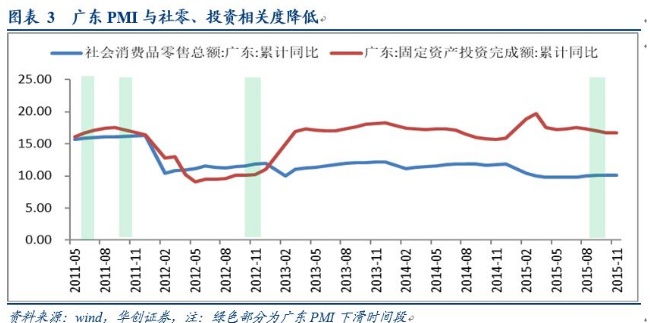2、在PMI下跌阶段,广东社会消费品零售总额和固定资产投资的同比增速并没有出现较明显的变化,说明PMI下滑与他们之间的联系较低。