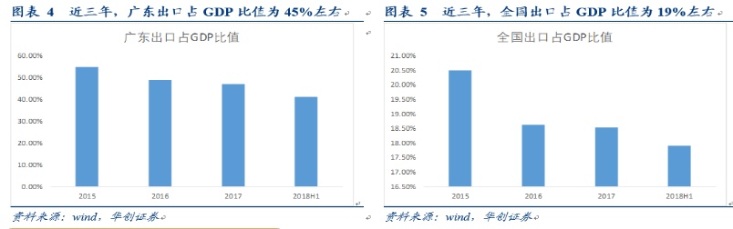 总的来说,广东PMI与出口相关度较高,与工业增速存在一定的关联,但与社零和投资之间联系较低。从实际数据来看,近三年广东出口与GDP的比值达到了45%左右,而全国仅有19%左右,因此广东的经济结构高度依赖对外出口,外部环境变化对其经济状况的影响也会更加显著。我们认为,广东PMI跌破荣枯线,出口是最主要的原因。广东出口依存度较高,次月工厂生产与之前的国外订单有着密切的联系,因此工业增速的下滑也主要与外需变化有关。