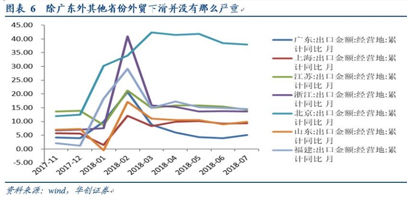 总体而言,我们认为,8月广东PMI下滑幅度较多并落入荣枯线以下,并不能说明全国经济基本面会失速下滑。广东PMI与出口相关度较高,与工业增速存在一定的关联,但与社零和投资之间联系较低。广东经济对出口的依存度较高,在贸易战不断发酵的背景下,反映经济基本面先导变化的PMI提前出现了下滑。但其他省份即便是在正式加征关税的前提下,出口金额同比增速保持相对稳定,整体受到的影响并不大。8月全国PMI依然呈现出生产小幅回升,内需对冲外贸下滑,需求呈现平稳态势。展望未来,经济基本面仍然面临贸易战继续升级的下滑风险,但考虑到宽货币到宽信用的不断传导,经济基本面出现大幅下滑的风险并不大。