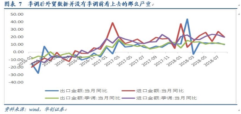 8月外贸数据有所放缓,但与预期相比不算差。周六海关总署公布的数据显示,以美元计价,中国8月进口同比增速为20%,低于前值27.3%,但高于预期的17.7%;8月出口同比增速为9.8%,低于前值12.2%和预期10%。8月外贸呈现出“增速有所放缓,但与预期相比不算差”的特征。从同比增速环比下滑幅度来看,8月进口和出口环比下跌7.3和2.4个百分点,但季调后环比下降了2.8和1个百分点,因此增速放缓也并没有季调前看上去的那么严重。