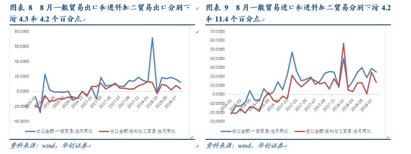 一般贸易和加工贸易均有所回落。分贸易类型来看,8月一般贸易出口同比增长11.9%,较前值降低4.3个百分点,进料加工贸易出口同比增速较前值下降4.2个百分点至3.5%;进口方面,一般贸易和进料加工贸易为24.8%和13.3%,较前值分别降低4.1和11.4个百分点,与出口一致,一般贸易和加工贸易进口均出现了回落。