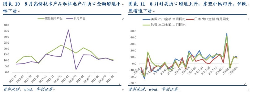 以美元计价,中国8月进口和出口同比增速分别为20%和9.8%,虽然数据有所放缓,但与预期相比不算差。商品结构方面,高新技术产品和机电产品出口规模增速分别小幅下滑1.4个和2.4个百分点,跌幅低于此前市场极度的悲观预期,说明了全国整体情况比广东这种出口型城市情况好,同时偏中上游产品进口数量增速有所上升也说明了内需并没有那么差。最后分国家和地区来看,8月对美出口抢跑,对东盟出口增持小幅升;对巴西和澳大利亚资源型国家进口增速上升外,对其余国家进口增速下滑。目前来看,中美贸易纠纷对中国进出口的负面影响低于此前市场悲观预期,尽管2000亿美元商品加税结果即将公布,预计短期外贸环境尚可,但长期影响仍需观察。