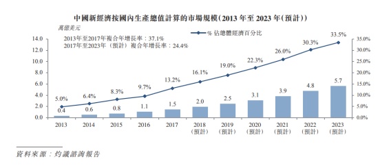 根据长期独立研究新经济行业的灼识咨询出具的研究报告显示,中国新经济的交易额已由2013年的0.4万亿美元增至2017年的1.5万亿美元,年增长率 37.1%,较同期 GDP 增长高出四倍以上。未来,预计新经济交易额将持续增长,于2023年达到5.7万亿美元,同期新经济GDP占比由2013年的 5.0%增至2017年的13.2%,预计2023年将达到33.5%。