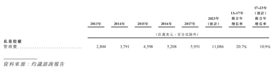 以私募股权基金为例,据灼识咨询统计,大中华地区私募股权公司的募资额由2013年约213亿美元增至2017年约573亿美元,4年时间“雪球”滚大近3倍,相应衍生的资产管理费也随之“水涨船高”,且未来5年势头正劲。