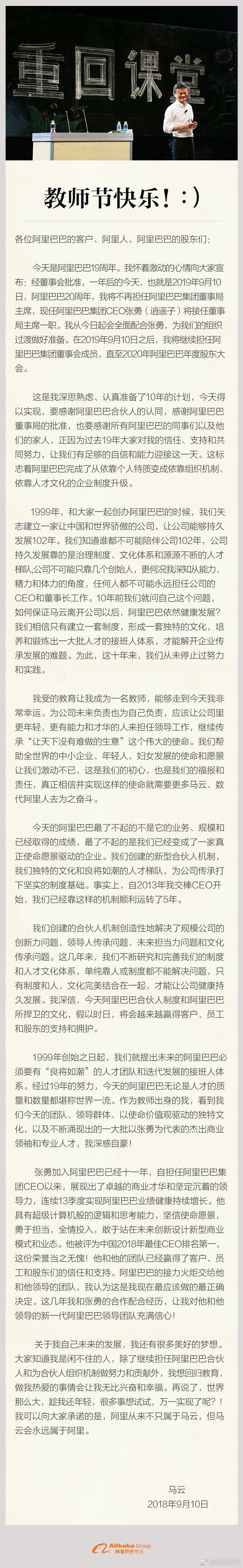 智通财经APP获悉,阿里巴巴官方微博和微信公众号均发布了一封马云的公开信,信中表示,一年后的阿里巴巴20周年之际,即2019年9月10日,他将不再担任集团董事局主席,届时由现任集团CEO张勇接任。