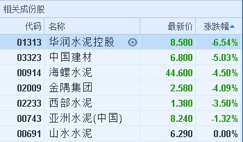 智通财经APP获悉,水泥板块全线下挫,截至10时20分,华润水泥(01313)跌6.54%,报价8.58港元,中国建材(03323)跌5.05%,报6.8港元,海螺水泥(00914)跌4.5%,报44.6港元,金隅集团(02009)跌4.09%,报2.58港元,西部水泥(02233)跌3.5%,报1.38港元。