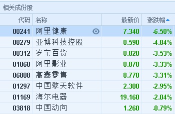 智通财经APP获悉,马云明年卸任董事局主席,阿里系早盘全线下挫,截至10时35分,阿里健康(00241)跌6.5%,报价7.34港元,亚博科技控股(08279)跌4.84%,报0.59港元,岁宝百货(00312)跌3.53%,报0.82%,阿里影业(01060)跌3.33%,报0.87港元,高鑫零售(06808)跌3.31%,报8.77港元。