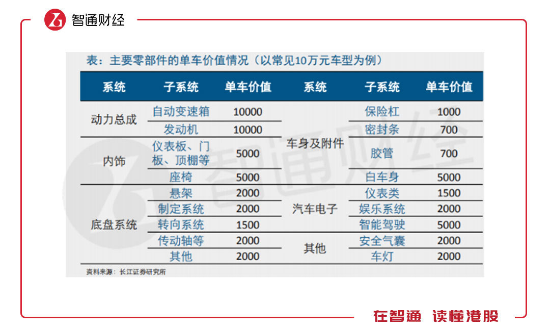 先看燃油车,按照长江证券的研究,以10万元车型为例,各系统价值合计5.58万元,动力总成占了35.8%,内饰及汽车电子占33%,底盘占17%,车身及附件占13.3%。