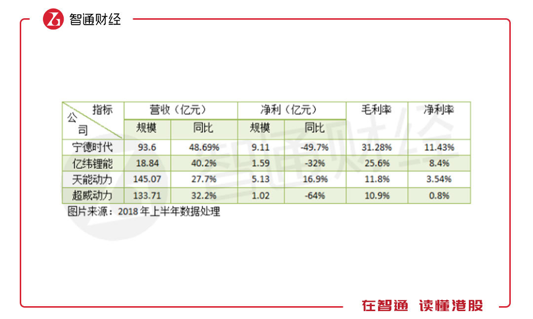 两大铅酸电池龙头天能动力(00819)和超威动力(00951)也在积极转型生产锂动力电池,锂动力电池成为国内未来电池行业角逐的主要战场。锂电池的成长能力及盈利能力要比铅酸电池高,上半年,由于政策影响,锂电行业净利润出现下滑较大,但净利率仍远高于铅酸电池。