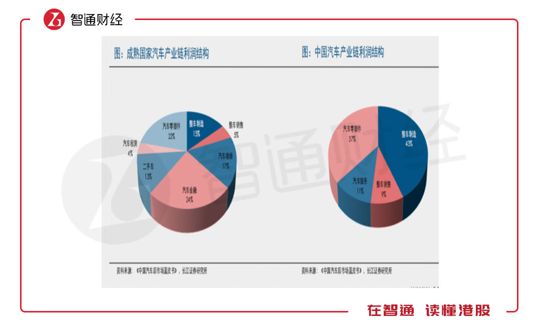 在港股上市公司中,汽车经销商主要销售的均为进口豪华车型,比如奥迪、奔驰及宝马车型,主要还是国内的自主品牌制造商有自己专门的销售渠道。整体来看,销售环节利润率一般都不高,净利率赚个售价的3-5个百分点左右。汽车后市场庞大,但目前市场较为零散,还未形成较大规模的企业。