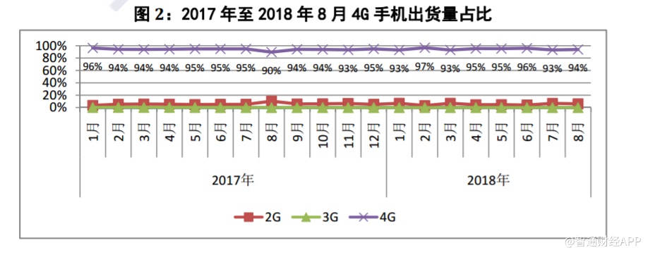 4G手机出货量占据主要部分,超过90%以上,为3059.4万部,同比下降17.2%。2G、3G手机出货量分别为199.5万部、0.6万部,同比分别下降53.2%和38.2%。