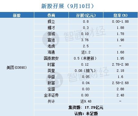 智通财经APP获悉,美团(03690)正在招股中,截至9月10日,富途、海通及国泰君安等13家券商总共为其借出近9.48亿孖展金,未足额。