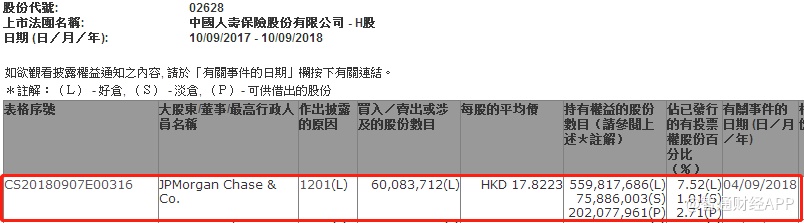 另外,摩根大通于同日则减持中国人寿(02628)6008万股,每股作价17.8223元,总值10.71亿元,最新持股量降至7.52%。