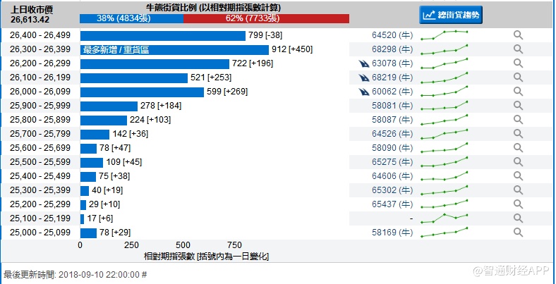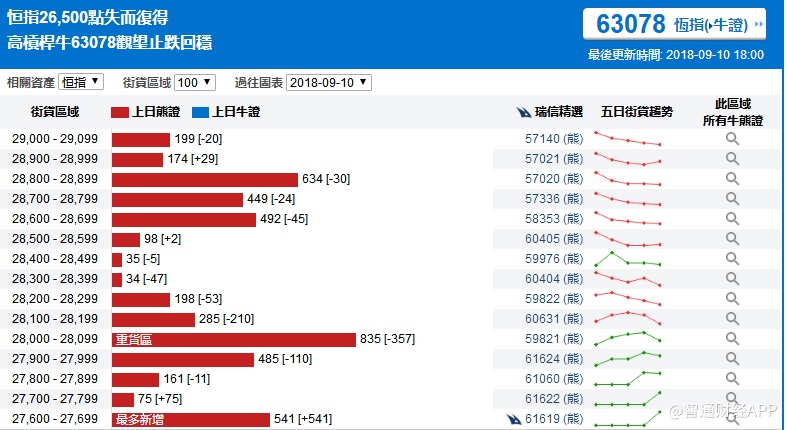 智通财经APP获悉,截至9月11日,恒指最新的牛熊街货比例为38:62。从瑞信恒指牛熊证街货分布图中得到的数据显示,熊证街货重货区在28000-28099区间,该区间熊证数量为835张,比上一交易日减少357张;最多新增在27600-27699区间。牛证中重货区在26300-26399区间,该区间最新牛证数量为912张,比上一交易日增加450张;最多新增也落在这一区间。