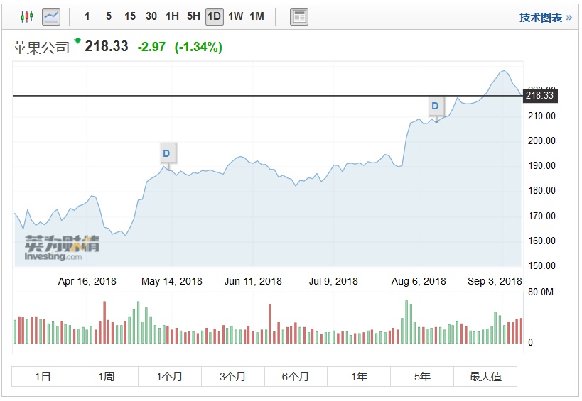 受此影响,周一苹果股价进一步承压,盘中最深跌超2%,触及216.47美元的8月24日以来新低。最终收跌1.34%,报218.33美元,创8月27日以来最低。