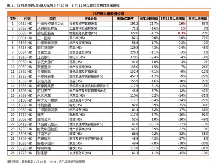 2015年至今港股通已经历了6次调入调出,本轮是第7次,我们认为港股通选秀惊喜已不如从前。我们统计了8月11日恒指公布调整名单以来,28只被调入港股通的标的中仅有3只涨幅为正,25只调入标的存在跌幅,其中彩生活(1778.HK)和呷哺呷哺(520.HK)等公司更是经历了45%和29%的跌幅。虽然这与港股大盘整体下跌有关,但我们曾经强调:在投资者熟悉了港股通调进调出的规则后,预计被调入的公司普遍得到提前关注与布局,导致公司估值和股价在调入之前经历了较大涨幅,所以调进之后惊喜不大。例如本轮调进港股通的澳优(1717.HK)和江南布衣(3306.HK),从去年7月至最高涨幅达249%和198%,因此8月11日以来股价跌幅达到了较高的20%和22%,从最高点回撤了25%和38%。整体来讲,随着港股通选秀的不断淘汰换新,较优质个股已被挖掘进入港股通,我们期待新上市公司为港股通注入新血。