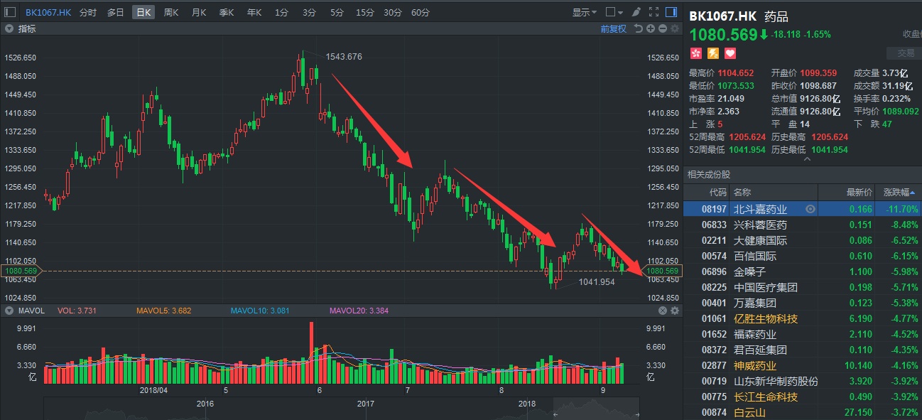 据智通财经APP观察,截至9月10日,上证跌了1.21个点;恒指跌幅超过1.33%,50只成分股,仅包括九龙仓置业(01997)在内的6只股票小范围飘红,而医药板块方面,继续下挫,普遍以“挂绿”收盘,大势可谓惨不忍睹。