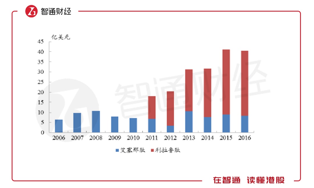 从2005年发展至今,全球已有6种GLP-1受体激动剂相继获批上市,整个GLP-1受体激动剂类药物的全球市场规模已超过40亿美元,2011-2016年的复合增长率超过15%。而艾塞那肽作为最早上市的GLP-1类似物,上市后销售额快速增长,早在2008年就突破10亿美元。