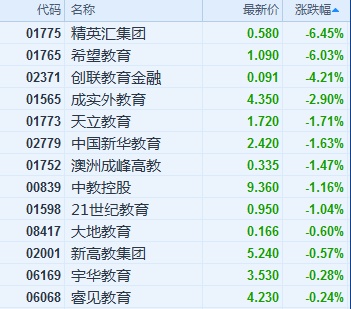 智通财经APP获悉,教育板块于2018年9月11日持续走弱,截至11:36,希望教育(01765)领跌6.03%,报价1.090港元,成交额达2013万港元。精英汇集团(01775)跌6.45%,报价0.580港元。创联教育金融(02371)跌4.21%,报价0.091港元。