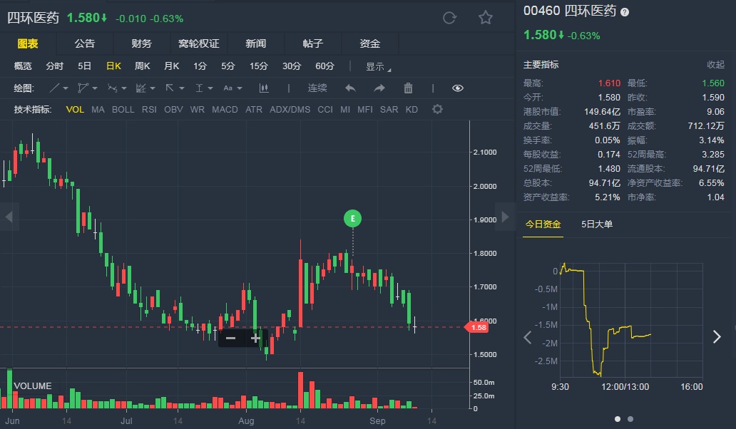 截至9月11日14:15, 四环医药跌0.63%, 报1.580港元。