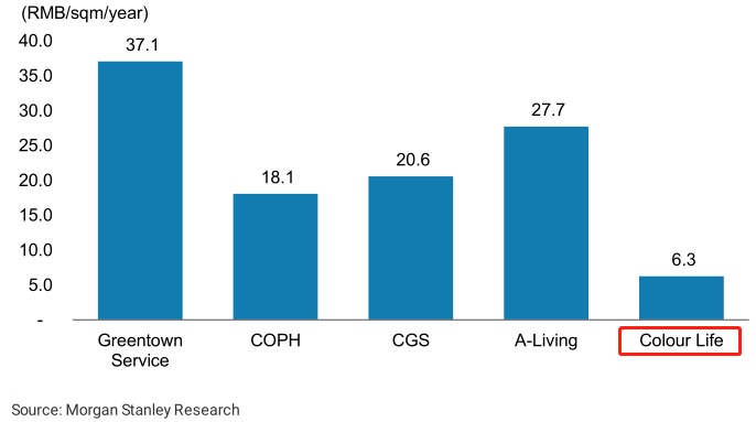 从多家机构统计的数据来看,彩生活的百万平米用工数行业最少。也就是说,彩生活的基础物业管理效率行业内最高,每平米成本业内最少。