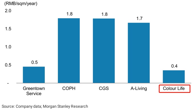 根据上述分析,彩生活在员工成本上有很大的竞争优势。大摩在近期发布的关于社保新政对物业行业影响的报告也显示,预测2019年,彩生活的每平米成本(于自管面积内)将是业内最少的,仅为6.3元人民币/平米/每年,仅占最高位——绿城服务(02869)37.1元人民币/平米/每年的17%。同时,根据大摩的判断,如果按照社保新政严格执行,彩生活每平方米新增的成本也是行业内最少的。