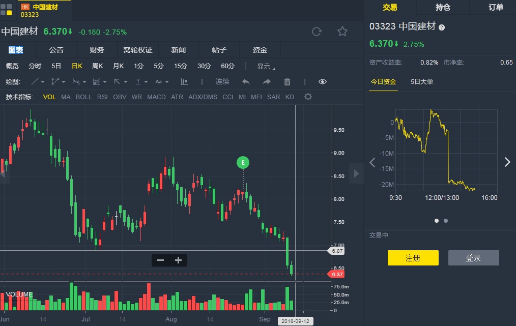 截至2018年9月11日14:52,中国建材跌2.75%,报6.370港元。