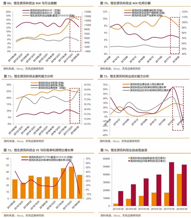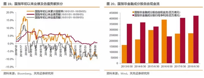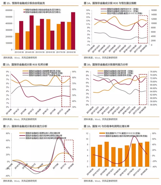 恒指、国指非金融成分股18年中报表现与全部港股非金融企业基本一致,净利率改善拉动ROE上升。从恒指与国指的非金融成分股来看,两大指数非金融成分股18年中报表现与前文全部港股非金融公司表现基本一致。中报同期数据来看,恒指非金融成分股16至18年中报年化ROE分别为7.00%、9.85%、11.77%;国指非金融成分股16至18年中报年化ROE分别为7.44%、11.93%、11.46%,总体稳中向好。结合杜邦分析看,净利率改善同样是两指非金融成分股ROE向好的主要原因,恒指、国指非金融成分股18年中报净利率分别为11.04%、7.33%,较17年年报分别增长2.03%、1.17%,但净利润同比增速也都有所放缓,预计下半年两大指数同样将面对市场压力。