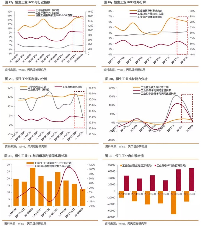 结合盈利能力来看,ROE方面各恒生行业与全部港股数据表现出同样的趋势,18年上半年年化ROE较17年年报均出现明显上涨,但是与17年上半年同期数据相比涨幅有所下降,考虑到可能是年化数据放大了相应的季节性差异。我们同样对各行业的年化ROE进行了杜邦分解,从杜邦分析的结果来看,各恒生行业维持了全部港股及主要指数表现的趋势:各恒生行业的杠杆率水平总体保持稳定;总资产周转率大部分行业出现略微下行,但相对波动幅度不大;净利润率的提升仍为支撑各行业ROE抬升的主要因素。