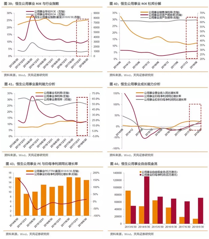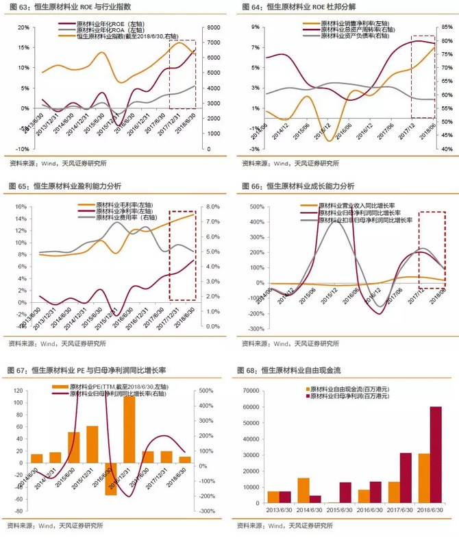 进一步对行业盈利能力进行分析,我们发现大部分恒生行业净利润率的提高伴随着成本端与费用端的双重改善。18年中报数来看,大部分恒生行业的净利润率与毛利润率均较17年年报及上半年同期水平有明显提升,而期间费用率(包括管理费用、销售费用、财务费用及其他费用)也表现出明显的下行趋势。具体数据来看,18年上半年综合业、地产建筑业、公用事业在各恒生行业中净利润率相对领先,分别为13.73%、13.42%、12.18%,较17年年报提升了1.11、1.51、1.00个百分点,同时其毛利润率相对于17年年报也分别提升了1.13%、2.82%、0.45%,成本端存在明显改善。我们并没有从上市公司的中报数据中看到原材料涨价对中下游企业利润率的明显挤压,仅恒生工业利润率出现一定程度下滑。进一步比较期间费用率,发现其期间费用率均较17年年报也有所改善,综合业、地产建筑业、公用事业分别降低0.17、1.08、3.2个百分点。