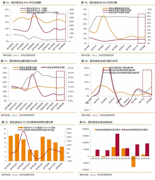 结合自由现金流与归母净利润数据来看,不同恒生行业之间差别较为明显,这与行业自身的经营特点有关。考虑到现金流数据受企业经营活动的季节性影响较大,此处我们仅对各恒生行业13年至今的上半年度数据进行比较。从统计结果来看,综合业、地产建筑业和工业18年上半年自由现金流数据相对17年同期出现明显改善;而电讯业与能源业18年中报自由现金流有所回落。